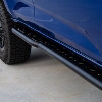 With military-style reversed dimple-die plates for strength, foot grip and drainage our rock sliders are second to none. A high lift jack can be used anywhere along the slider if needed. Easy to install, these Rock sliders cup and bolt directly over your chassis.